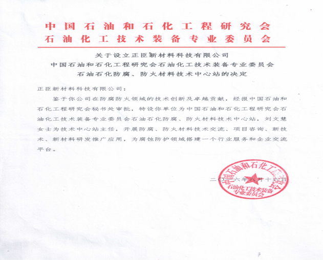 鑒于正臣公司在防腐防火領(lǐng)域的技術(shù)創(chuàng)新及卓越貢獻(xiàn),經(jīng)報(bào)中國石油和石化工程研究會(huì)秘書處審批,特設(shè)你單位為中國石油和石化工程研究會(huì)石油化工技術(shù)裝備專業(yè)委員會(huì)石油石化防腐、防火材料技術(shù)中心站。
